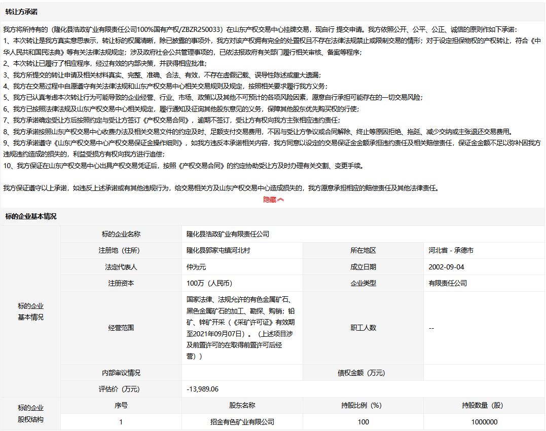 隆化縣浩政礦業(yè)有限責(zé)任公司100%國有產(chǎn)權(quán)