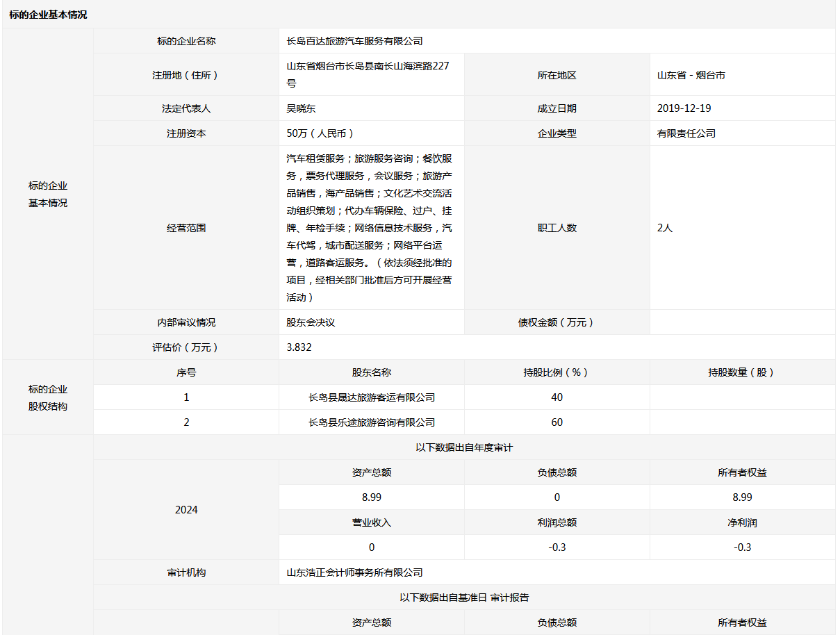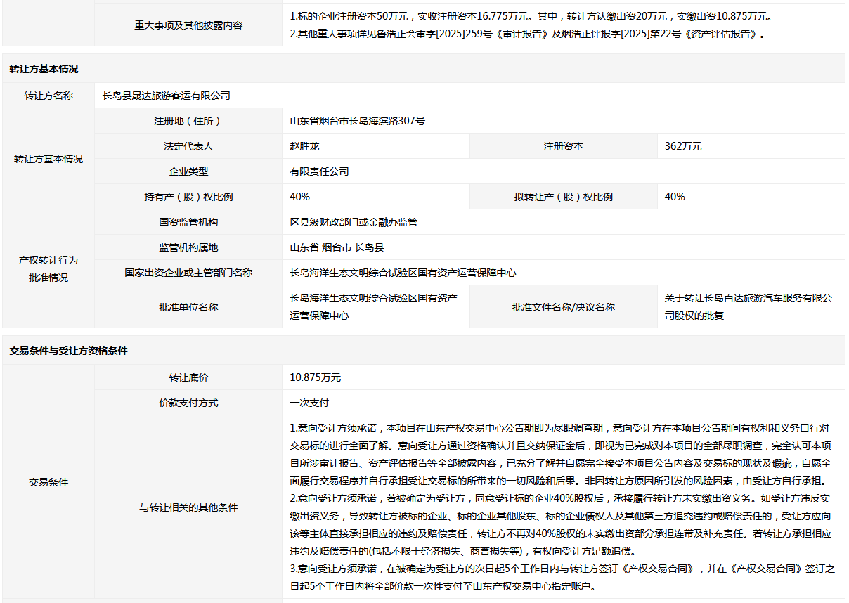 長(zhǎng)島百達(dá)旅游汽車服務(wù)有限公司40%國(guó)有股權(quán)