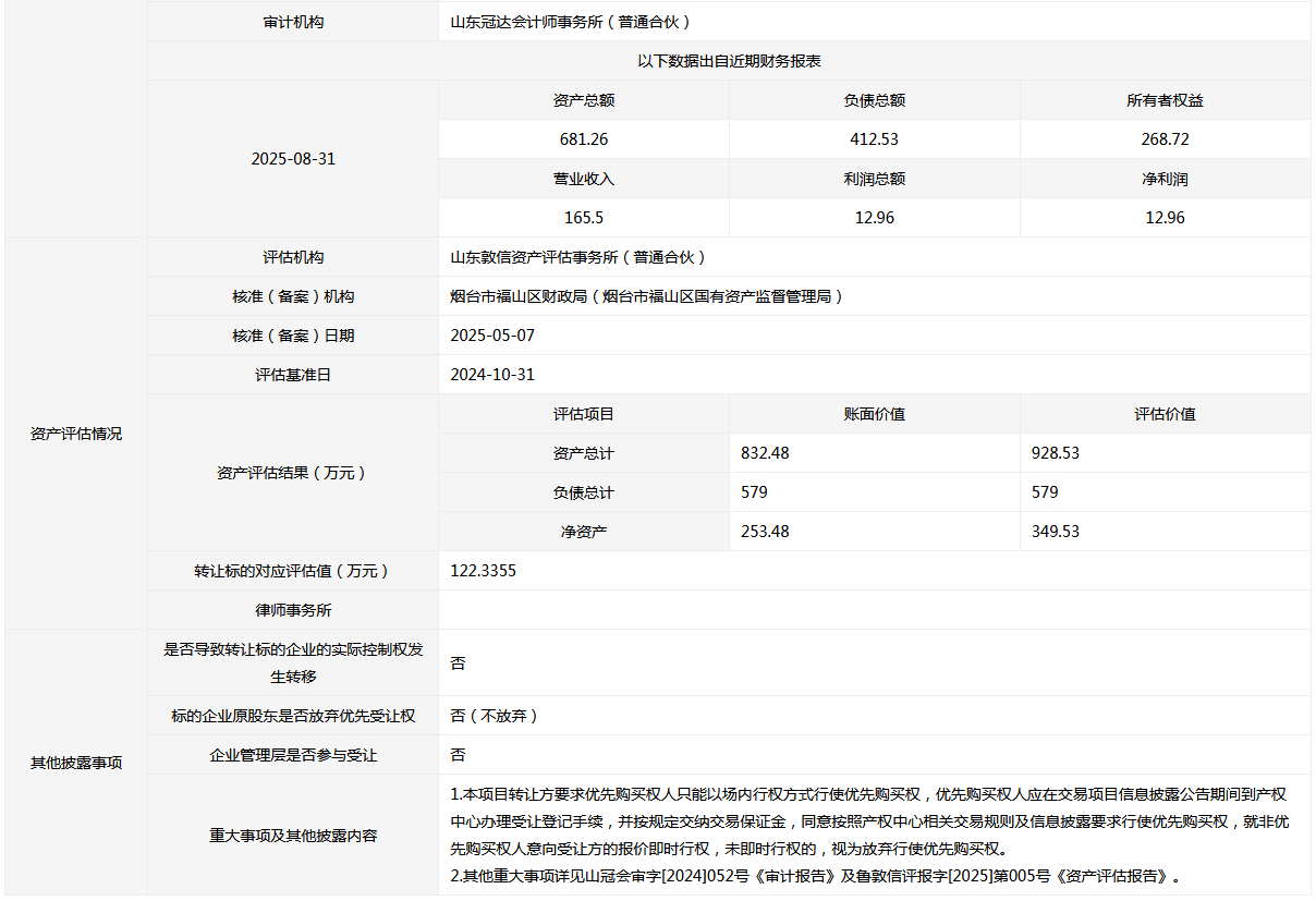 • 轉(zhuǎn)讓方: 煙臺(tái)市福山區(qū)財(cái)政局(煙臺(tái)市福山區(qū)國有資產(chǎn)監(jiān)督管理局)