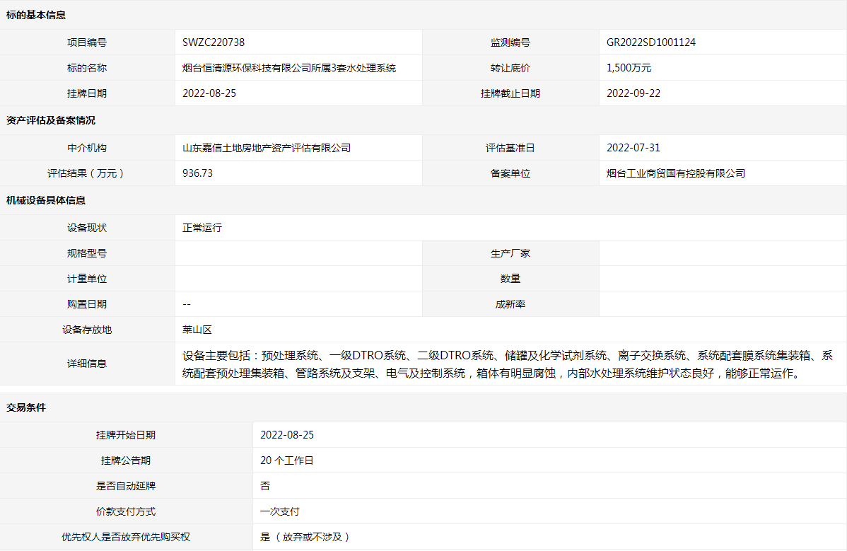 • 轉(zhuǎn)讓方:煙臺恒清源環(huán)保科技有限公司